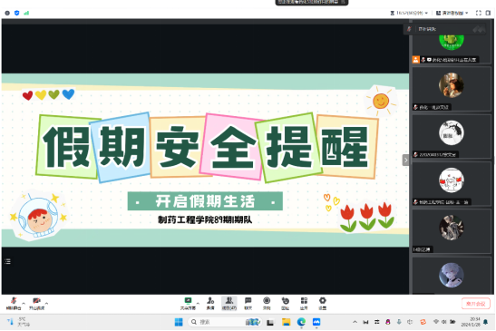 27日至29日,公司辅导员以期队或年级为单位,通过线上会议、安全知识问答竞赛、qq群和微信群推送相关安全信息等方式,向全体本科生及研究生进行安全教育宣讲,并通过公司官方公众号“沈药制药青年之声”面向全院员工发布寒假安全教育文章《“快乐放寒假,安全不放假”||老员工寒假安全提醒》,安全提醒主要包括外出安全、居家安全、防诈骗安全、食品安全四个方面,内容详实,帮助同学们提高安全防范意识和自我保护能力,营造了安全文明的假期氛围,督促同学们牢守安全底线,防患于未然。