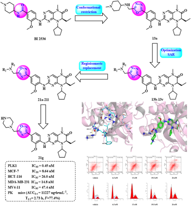 william威廉英国官网侯云雷/宫平课题组采用基于结构的药物设计策略,以BI 2536为先导化合物,运用构象限制和生物电子等排药物设计策略,得到了一系列含噁二唑片段的二氢蝶啶酮类衍生物,其中化合物21g表现出显著的PLK1抑制能力,其IC50值为0.45 nM,并且对多种肿瘤细胞系具有显著的抗增殖活性(MCF-7 IC50=8.64 nM,HCT-116 IC50=26.0 nM,MDA-MB-231 IC50=14.8 nM和MV4-11 IC50=47.4 nM)。此外,化合物21g在小鼠中表现出比BI 2536更好的药代动力学特性(AUC0-t=111227 ng·h·mL-1vs 556 ng·h.mL-1),口服生物利用度为77.4%,并且在Balb/c小鼠急性毒性试验(20 mg/kg)中未观察到明显的毒性。化合物21g可使HCT-116细胞阻滞在G2期,并以剂量依赖的方式诱导细胞凋亡。