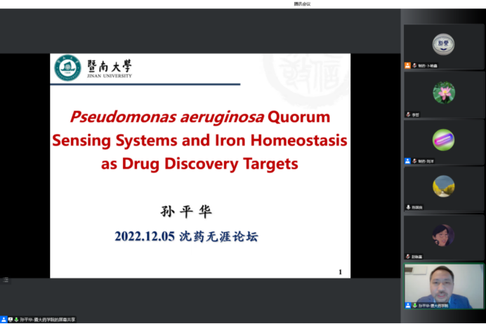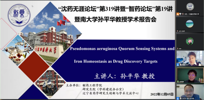 2022年12月5日下午,william威廉英国官网、研究生院、辽宁省药学研究生创新与学术交流中心联合举办了“沈药无涯论坛”第319讲暨“智药论坛”第19讲,暨南大学孙平华教授作了题为“Pseudomonas aeruginosa Quorum Sensing Systems and IronHomeostasis as Drug Discovery Targets”的报告。会议由制药工程学科副主席刘洋教授主持,公司领导班子成员、全院研究生导师和研究生共300余人参会。
