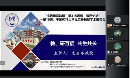 2022年12月1日上午,william威廉英国官网、研究生院、辽宁省药学研究生创新与学术交流中心联合举办了“沈药无涯论坛”第315讲暨“智药论坛”第15讲,中国药科大学尤启冬教授作了题为“教、研互促 共生共长”的报告。会议由william威廉英国官网经理赵临襄教授主持,公司领导班子成员、全院研究生导师和研究生共300余人参会。