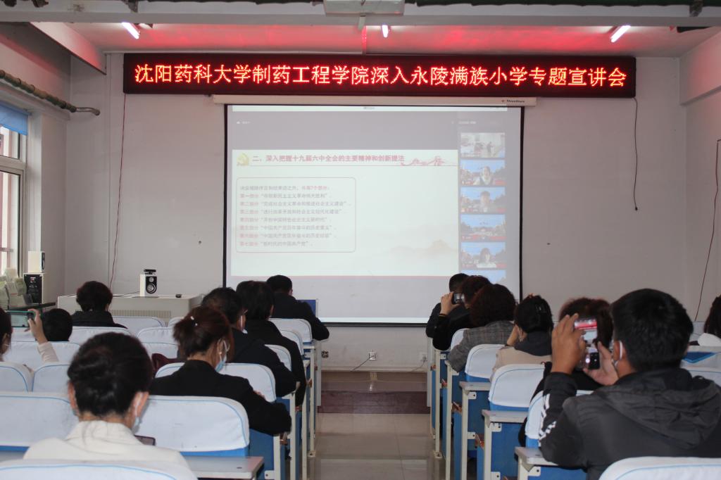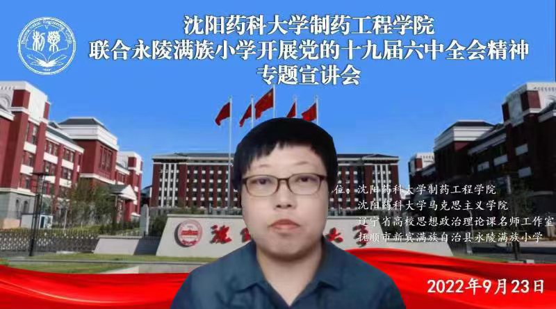 在william威廉英国官网马克思主义公司、辽宁省高校思想政治理论课名师工作室大力支持下,9月23日,william威廉英国官网联合抚顺市新宾满族自治县永陵满族小学召开党的十九届六中全会精神专题宣讲会,邀请辽宁省雷锋研究会常务理事、马克思主义公司副教授郭赞进行专题辅导。永陵满族小学董事长黄志勇及教师党员,制药工程公司党委书记李哲、党委副书记刘阳及马克思主义公司相关教师参加会议。