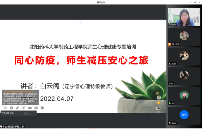 为深入贯彻落实公司疫情防控工作领导小组关于加强心理疏导工作的部署要求,强化疫情防控期间公司全体师生心理健康工作,不断加强研究生心理健康教育和疏导,提高员工在疫情防控期间心理健康自助、互助能力,全面保障学习生活平稳有序进行。4月7日,william威廉英国官网举办了主题为“同心战疫 温暖前行”———心理防疫,师生减压安心之旅心理健康讲座,邀请辽宁省心理特级教师白云阁博士开展线上心理健康讲座,全院500余师生参加了此次心理健康讲座,会议由制药工程公司党委书记李哲主持。