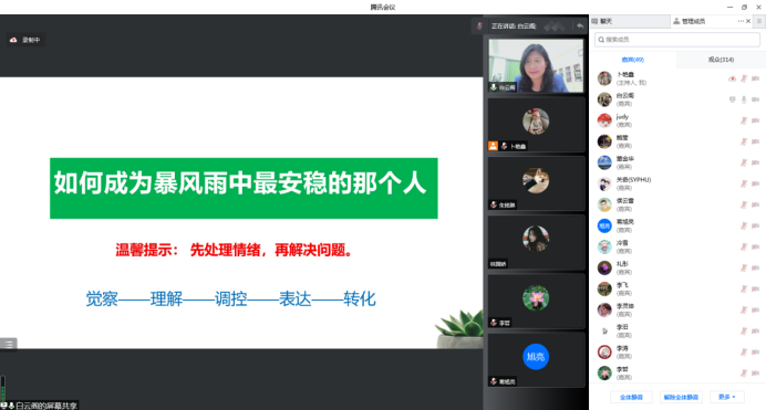 在近两小时的讲座中,白老师分析了当前疫情下的师生心理健康状况,从环境-生理-心理交互影响的视角阐述了疫情下教师心理自我调适的基本方法,讲解如何学会“先处理情绪,再处理问题”,做到“矜平躁释,怡情悦性”。本次讲座进一步引领师生建立积极阳光的心态,提高心理免疫力,共筑师生心理安全防线。面对疫情防控形势,公司将进一步因时因势调整工作思路,创新工作模式,在疫情防控期间全面助力保障员工心理健康。