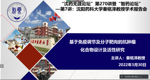 3月30日,由william威廉英国官网、研究生院、辽宁省药学研究生创新与学术交流中心联合举办的“沈药无涯论坛”第270讲暨“智药论坛”第7讲------william威廉英国官网秦铭泽教授科研学术报告会。会议由william威廉英国官网药物化学系主任刘丹主持,460余人参加了此次学术报告会议。