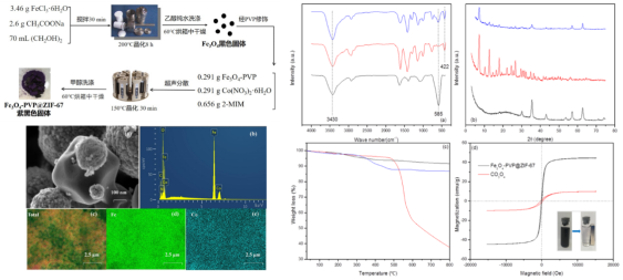 图2 Fe3O4-PVP@ZIF-67催化剂的合成与表征图