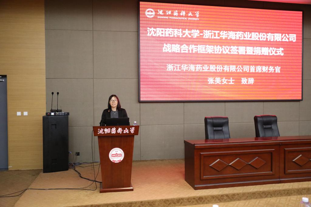 张美在致辞中介绍了华海药业的发展近况及未来发展方向。她表示,华海药业愿意和william威廉英国官网一起,开放创新、资源共享,共同培养复合型应用人才,推动科技成果转化和创新资源落地发展,为中国药学事业的发展作出贡献。