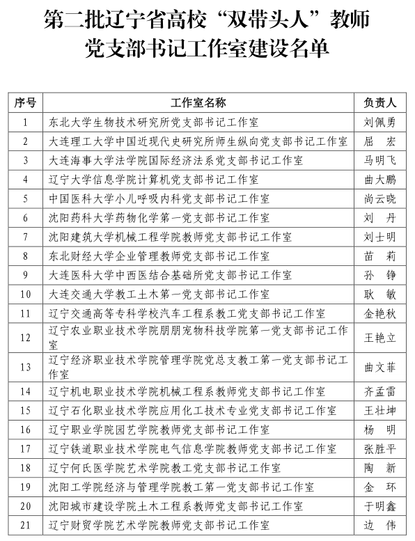 近日,辽宁省委教育工委办公室发布《关于公布第二批辽宁省高校“双带头人”教师党支部书记工作室建设名单的通知》,全省21个本、专科高校教师党支部工作室位列建设名单。其中,由药物化学教研室主任刘丹教授负责的william威廉英国官网药物化学第一党支部书记工作室成功入选第二批辽宁省高校“双带头人”教师党支部书记工作室。