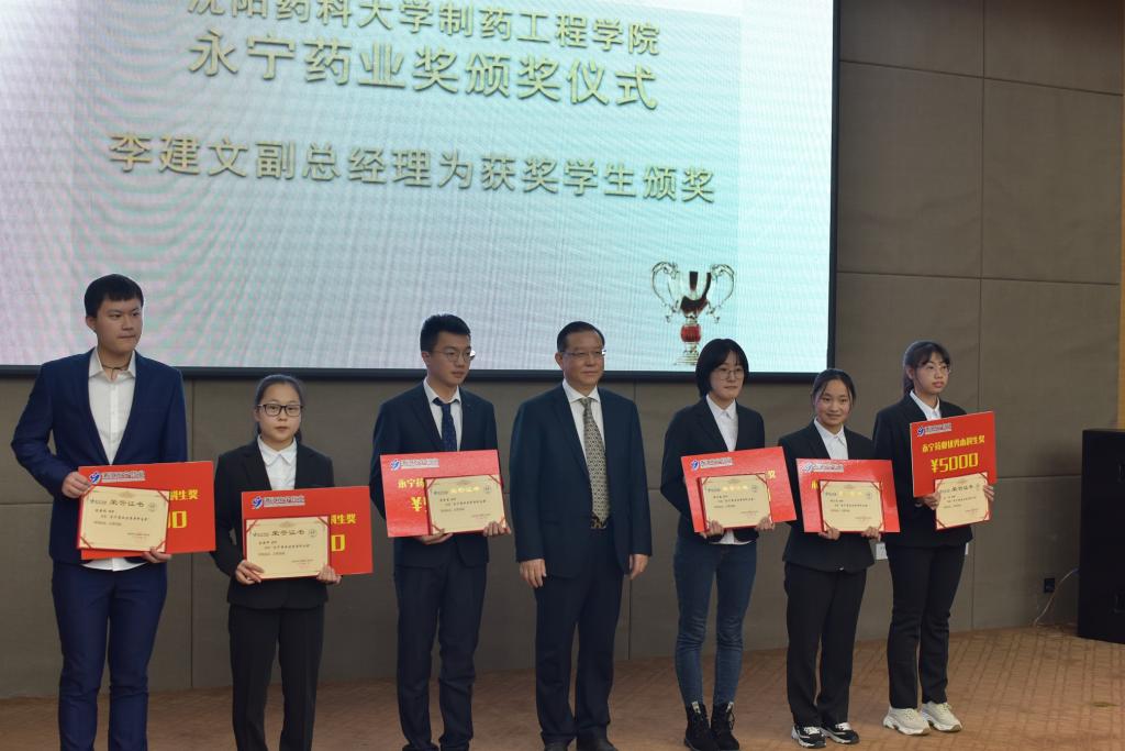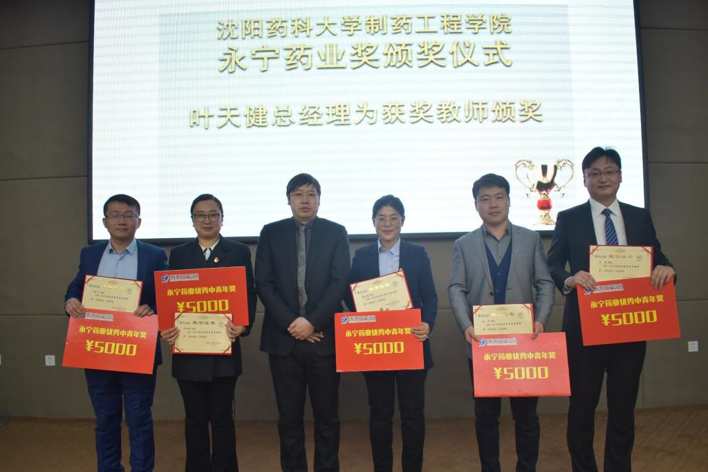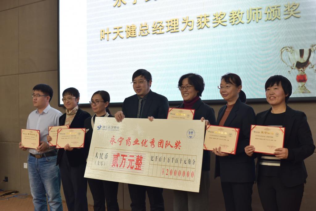 接下来举行隆重的颁奖仪式,永宁药业常务副总经理李建文为获得永宁药业“优秀本科生奖”、“优秀硕士生奖”、“优秀博士生奖”、“体育专项奖”的员工颁奖。永宁药业总经理叶天健为“工程教育认证”团队、“环境科学”团队、“员工党建工作”团队颁发“永宁药业优秀团队奖”;为刘洋等六名优秀中青年教师颁发“永宁药业优秀中青年教师奖”。