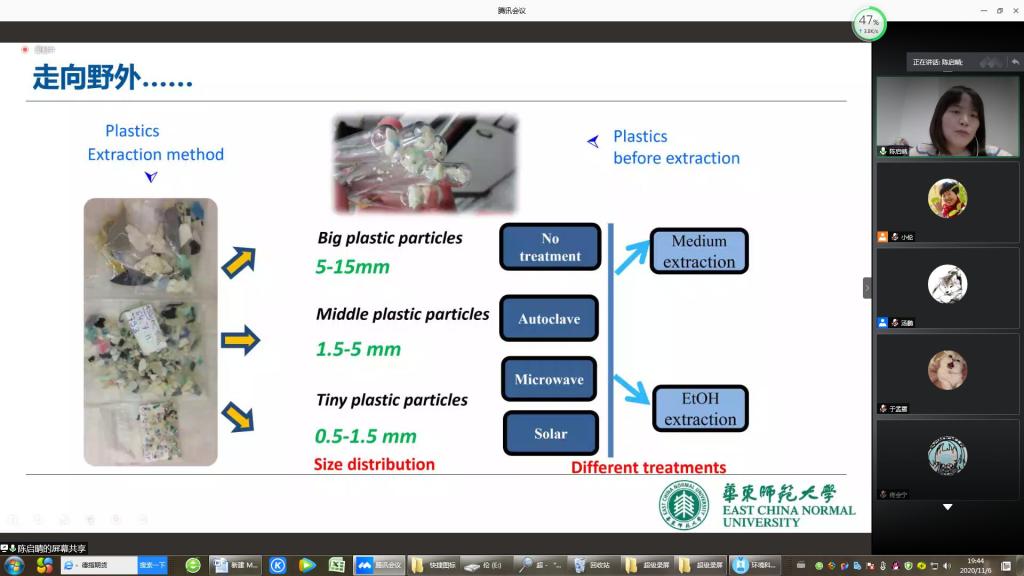 在线上分享中,陈启晴员工首先简明扼要地汇报了个人的求学经历和科研成长之路。然后深入浅出、详尽地介绍了水环境中微塑料、纳米材料及其复合污染的生物效应研究,通过识别水环境中塑料残骸上的有机污染负载特征,建立了微塑料“载体”作用的潜在风险评估和预测方法。陈启晴员工关于微塑料的研究成果填补了我国在塑料负载有机污染物的复合污染特征方面的空白,为塑料废弃物的管理和塑料污染治理提供了坚实的科学依据,奠定了坚实的理论基础。陈启晴员工以个人的成长经历为在校的学弟学妹们、尤其是考研同学树立了科研之路的典范,更坚定了他们走科研道路的决心和信心。陈启晴员工精彩的科研分享在与会员工中引起强烈反响。参会的同学们分别就关心的微塑料降解、PPCP毒理研究现状、同济大学环境类研究方向、学业规划等问题与陈启晴学姐展开了亲切愉快的交流。同时,陈启晴员工表达了对环境科学专业教师的深深感谢,正是老师们一直以来的专业自信才促使她毕业后坚决选择环境科学专业读研;正是环境科学专业特色鲜明人才培养模式,才使得她在后来的科研路上思路开阔。陈启晴员工的精彩分享,对环境专业员工的学业和科研成长规划具有重要指导意义,大大提升了员工本专业深造的信心。最后,环境科学教研室教师就校际合作、聘请兼职导师、科研交流合作等方面进行了深入探讨,并达成初步共识。