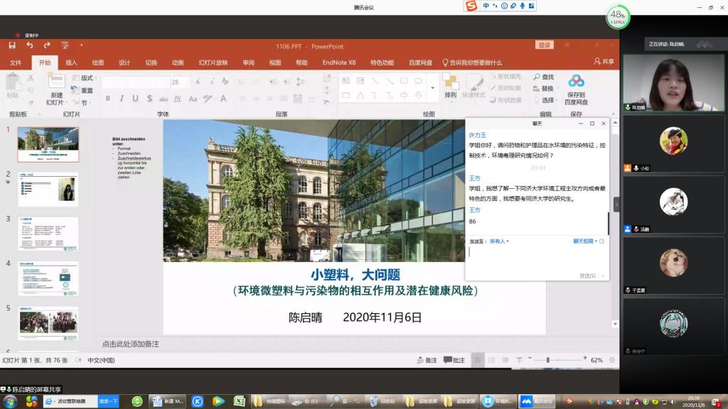 本次活动邀请了公司环境科学专业71K毕业生、现就职于华东师范大学河口海岸学国家重点实验室的陈启晴研究员做了题为“小塑料,大问题”精彩报告。讲座由环境科学专业负责人侯晓虹教授主持,环境科学教研室全体教师、环境科学专业四个年级在校生、以及其他环境科学毕业员工,共计130余人参加了此次云端盛会。