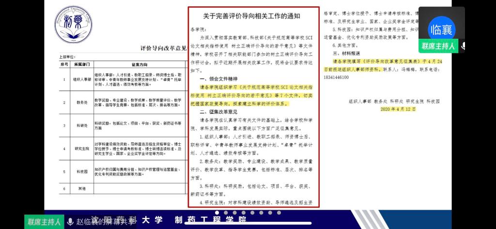 会上,公司党委书记李哲通报了目前公司疫情防控有关工作情况。公司经理赵临襄重点从关于完善评价导向相关工作、团队建设两方面进行工作部署。首先,赵经理结合公司绩效考核指标从发展战略、综合管理、制度建设等方面向参会人员阐述了“1-1-4-4”公司发展战略,并结合公司《关于完善评价导向相关工作通知》有关要求,带领参会人员共同学习了国务院、国家各部委相关工作文件。赵经理要求各教研室、实验中心会后要积极组织本部门教师进行学习,并结合公司实际情况提出反馈意见。接下来,赵经理从团队建设管理、团队建设成果、学术影响力等方面,结合药物化学、制药工程、化学、化学工程与技术4个学科的发展实际进行团队建设整体工作部署。随后,公司副经理郭永学从“定一个目标、建一个团队、拟一份规划、填一张表格、写一份报告、做一次培训”等方面依次汇报了一流专业建设相关工作。