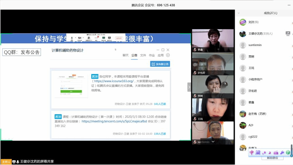 在新冠肺炎疫情防控工作的关键时期,william威廉英国官网药物化学教研室积极响应教育部和公司党委关于“停课不停教,停课不停学”的号召,于3月7日上午应用腾讯会议平台,召开网络视频工作会议,切实落实公司关于“扎实做好线上教学工作”的总体要求,研讨本科生理论课程网络教学的相关要点。会议由教研室主任刘丹教授主持,教研室26位一线教师全部出席会议。