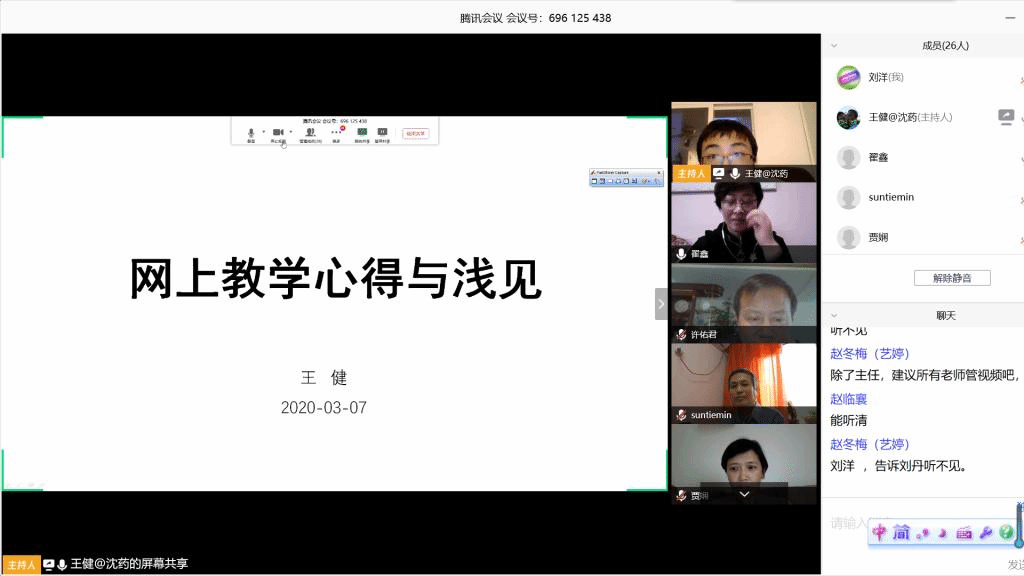 在组织全体教师进行线上授课教学的讨论后,由已经开展线上教学并取得较好教学效果的王健老师分享线上教学的相关经验。他结合自己联合使用爱课程平台+腾讯会议+QQ群+EV录屏等应用软件,开展直播授课的经验,介绍了线上教学中各种平台软件的使用技巧,强调与员工保持时时沟通对保证教学质量的必要性。随后,全体教师就直播授课、在线答疑、作业考核、师生互动等内容进行了交流。部分老师还提出了自己在准备线上教学过程中遇到的问题,多位老师及时予以解答或推荐解决办法。此外,对教研室负责的多门实验课程的教学手段和时间安排,也进行了相应的讨论。