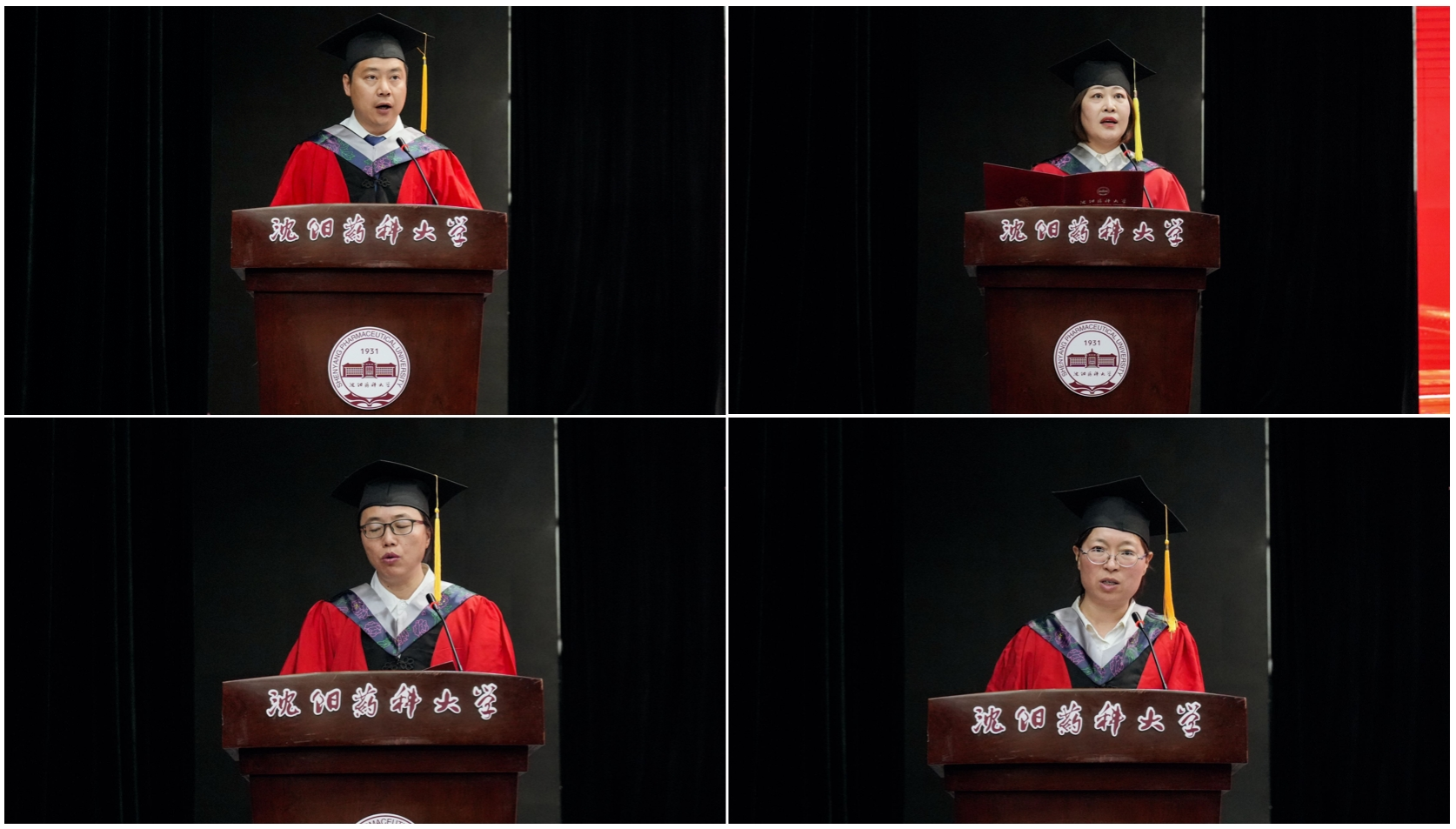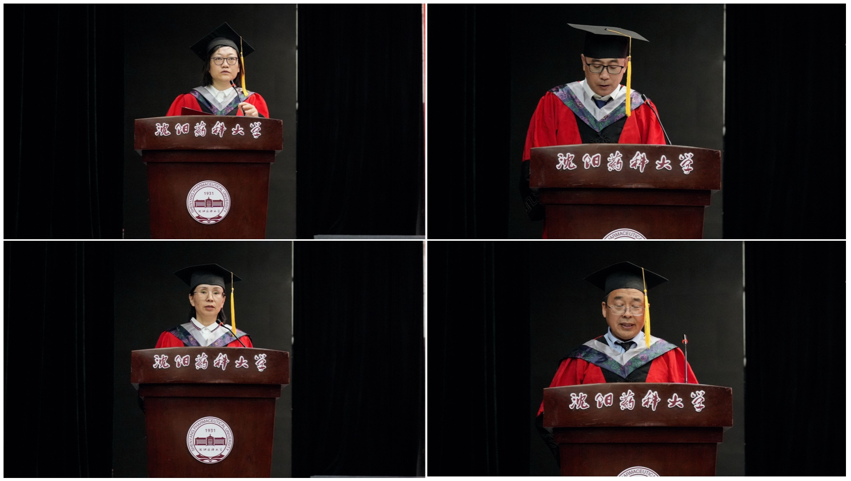 william威廉英国官网经理刘洋教授宣读2024届博士学位授予名单;药物化学学科主席翟鑫教授、制药工程学科主席刘洋教授、化学学科主席王绍宁教授、化学工程与技术学科主席赵燕芳教授分别宣读各学科2024届硕士学位授予名单;制药工程专业负责人刘丹教授、药物化学专业负责人郭春教授、环境科学专业负责人张聪璐副教授、应用化学专业负责人胡春教授分别宣读2024届学士学位授予名单。