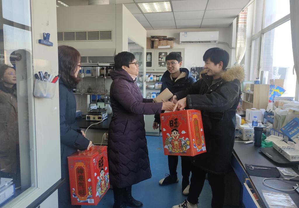 1月30日上午,李哲一行来到留校同学们的实验室及寝室走访看望、座谈畅聊,与同学们进行面对面交流。李哲亲切询问了留校员工的生活和学习情况,嘱咐同学们要劳逸结合,常与家人联系,汇报在校情况,避免家人担心;鼓励同学们利用好假期在校时间,不断充实自己。同时,她特意叮嘱同学们要严格遵守公司各项疫情防控规定,做好个人防护,注意人身和财产安全,安全实验,在公司过个平安吉祥年。老师们还为留校同学亲手送上公司精心准备的新年礼包与水果,祝愿大家度过一个温暖而有意义的春节。