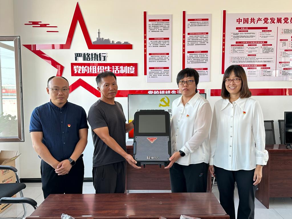 制药工程公司党委书记李哲和党委副书记刘阳向小塔子村赠送蓝牙音响。
