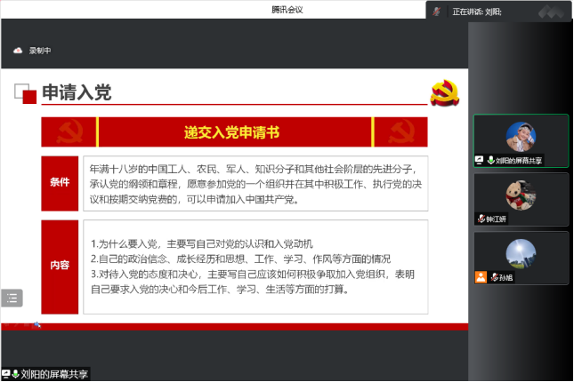 刘阳指出,大学是人生道路上新的起点,老员工应选择正确的人生方向,并为之坚持不懈地奋斗,这不仅关系到个人的人生发展前途命运,也关系到个人能否为社会进步做出贡献。她带领大家重温了习近平总书记在庆祝中国共产主义青年团成立100周年大会上对团员青年的希望要求,并通过列举疫情防控期间公司优秀教师和员工代表抗击疫情的真实写照,号召新生要向身边榜样学习,用自己的力量扛起属于青年的社会担当。她为新生详细讲解了发展党员的条件和流程,从递交入党申请书到成为正式党员要经历二十五个环节,每个环节都是严格规范的,她鼓励新生要积极递交入党申请书并接受党组织的考验,同时,对新生提出了期望和要求。
