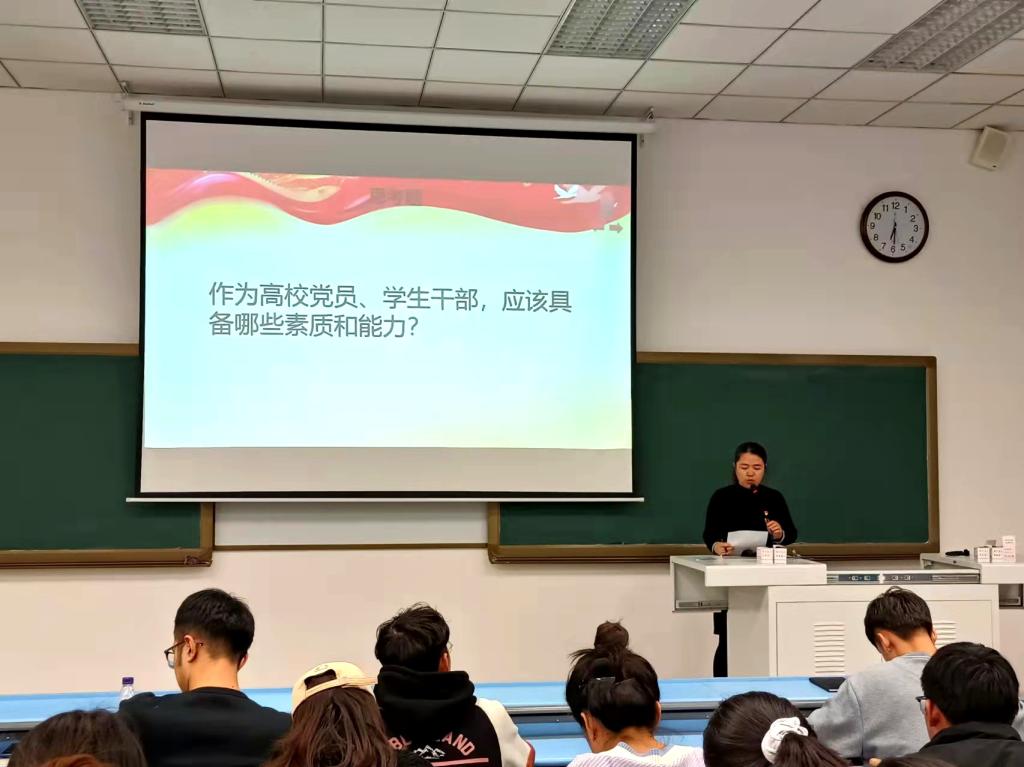 刘书记以“学习习近平在2021年秋季学期中央党校(国家行政公司)中青年干部培训班开班仪式上重要讲话”为主题,深入讲解了习近平总书记对青年干部提出的48字要求。她结合向警予同志的英雄事迹以及“洁洁良”事件的反思,有力诠释了信念坚定、对党忠诚的重大意义。她以本次活动为契机,对同学们提出三点希望和要求,一是要严格要求自己,以身作则,充分发挥先锋模范带头作用;二是要增强宗旨意识,积极担当作为,做好老师和同学间的桥梁和纽带;三是要珍惜光阴,不负韶华,勤学苦练,不断增强本领。