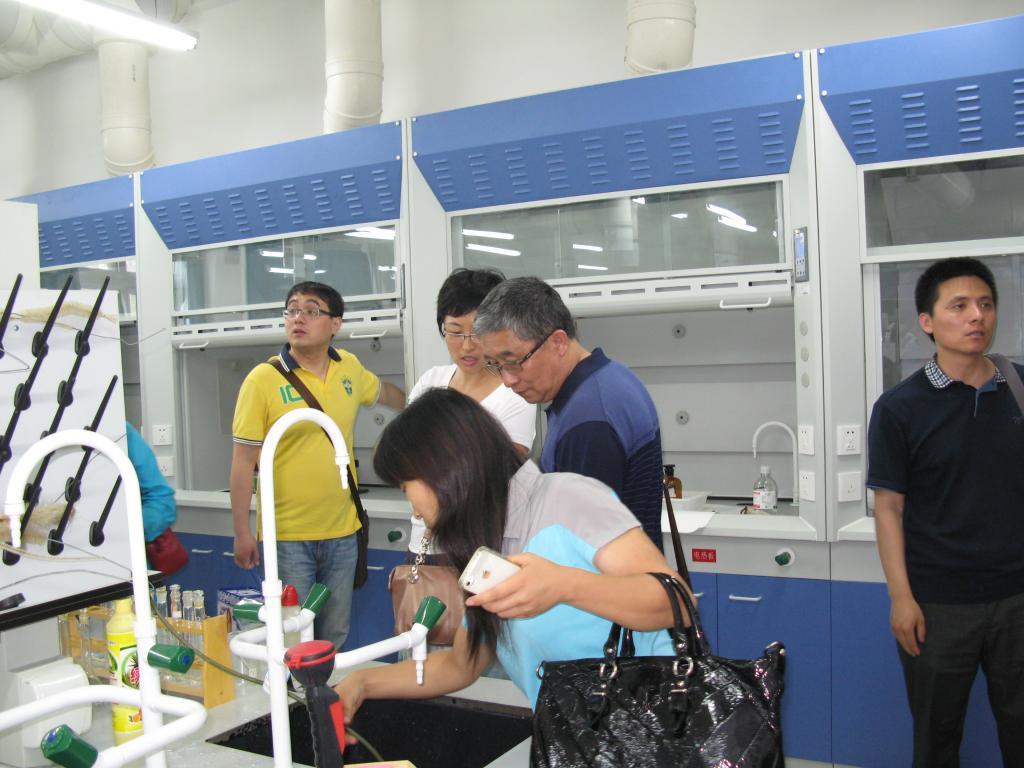 坐落在吉林大学前卫南校区的吉林大学理学部化学公司的化学实验中心是国家级首批实验教学示范中心,包括有无机化学基础实验室、有机化学基础实验室、分析化学基础实验室、物理化学基础实验室等。中心主任郭玉鹏教授、无机化学系主任、博士生导师张萍教授和中心魏士刚副主任热情迎接了前往考察参观的全体成员,向大家介绍了实验中心的建设状况、特色优势、发展定位以及总体规划等,并且引领大家到各个楼层的实验室、准备室和资料室等,亲临有机化学实验考试现场和分析化学设计实验课堂,体验这里的学习氛围和教学风格。在热烈而真诚的气氛中两校同行就实验教学现状和存在问题以及管理机制等诸方面进行了全方位多角度的研讨,王国清教授和郭春教授与张平教授和郭玉鹏教授还就实验教学中的员工素质教育进行了深入的交流。